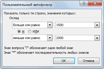 - В открывшемся окне Пользовательские фильтры подставляем значения в автоматически настроенные поля: